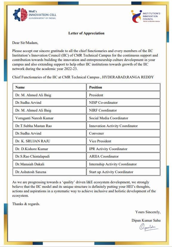 | 2 | Dr. M. Ahmed Ali Baig | Mechanical Engineering | Professor and Dean Administration | Doctorate | President,IIC and NIRF Coordinator |